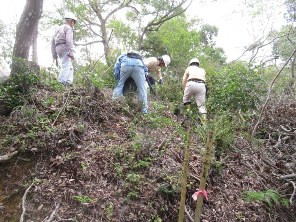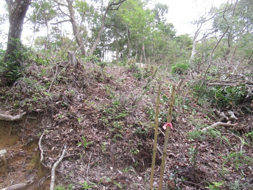 未分類2026.01.14道づくり・地番2整備 ポスト シェア はてブ 送る Pocket 2025年(令和7年)9月27日(土) 鬼が城山道づくり&地番2整備 参加者10名 道づくりと地番2の整備を並行して実施した。 道づくりは尾根近くのコナラを伐採し、重機はほぼ登山道の尾根まで進んだ。 地番2は今年2月に桜を植樹した地で、登山道近くはほぼ全伐している。 本日は萌芽した木と小木を伐採。 昨年、登山道近くに棚積みしていた木を谷側に移して景観を良くした。 作業前 作業中 作業後