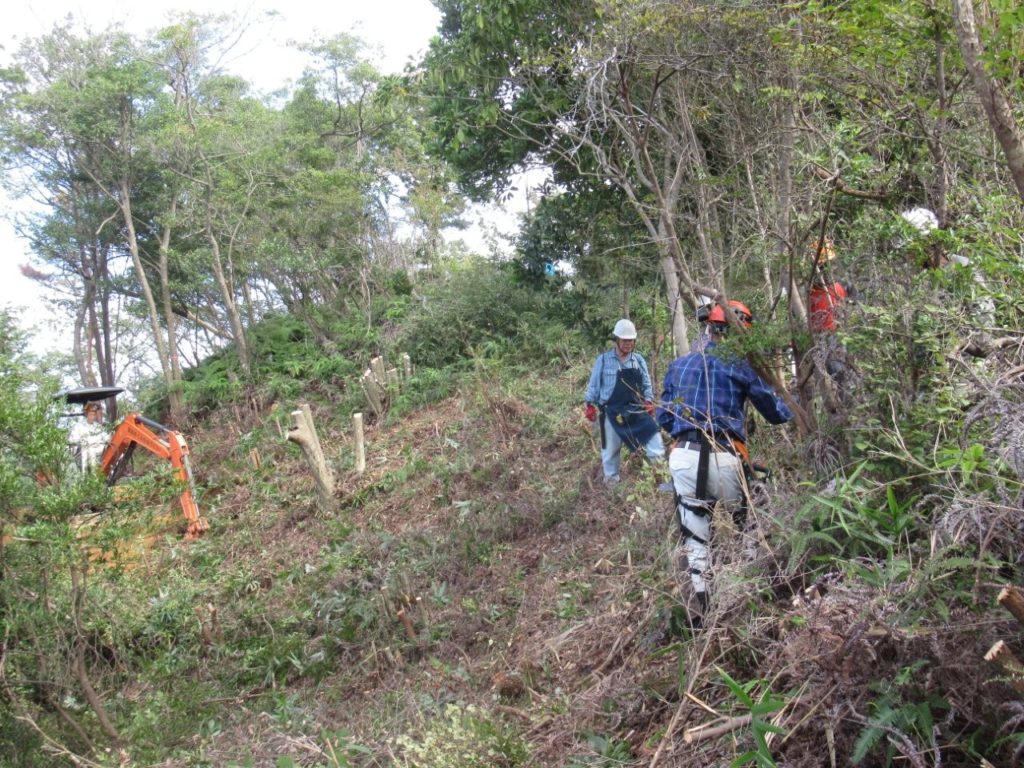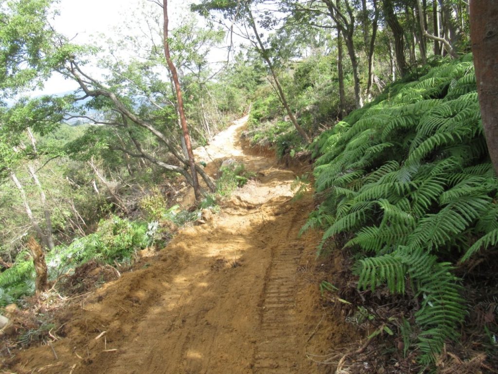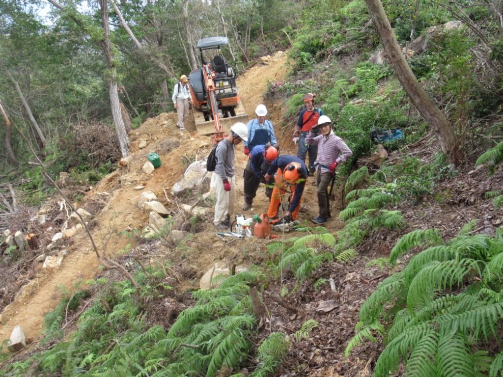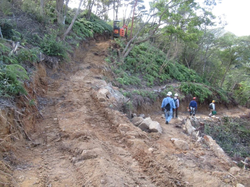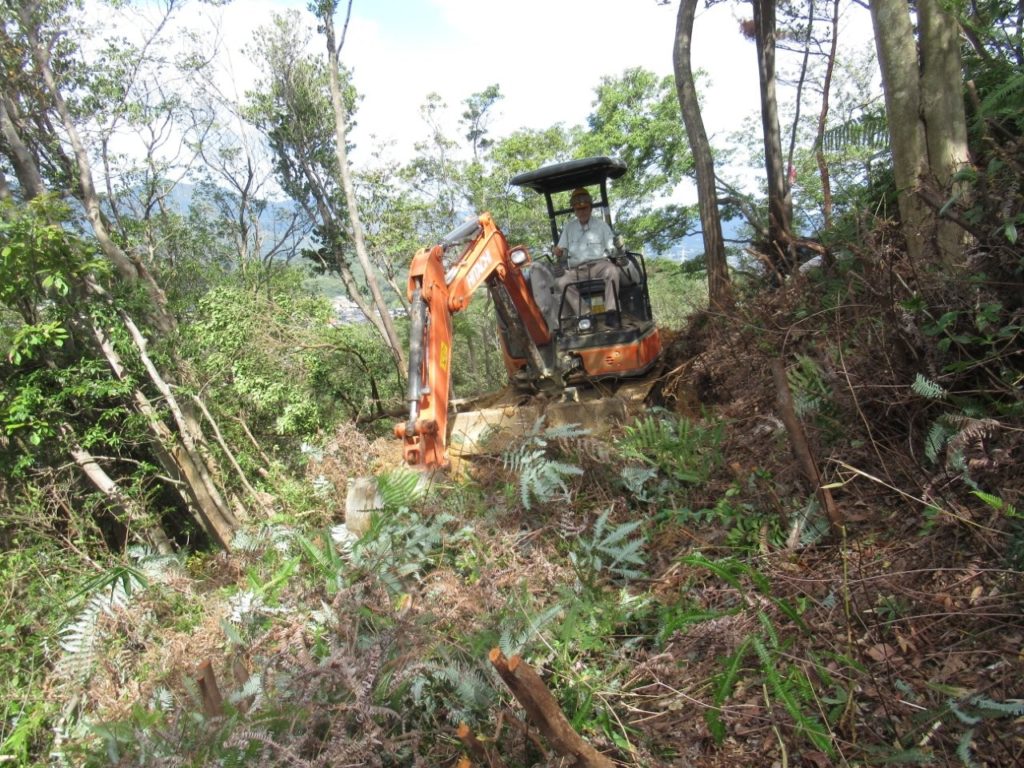 未分類2026.01.14鬼が城山北の道づくり ポスト シェア はてブ 送る Pocket 2025年(令和7年)10月9日(木) 参加者8名 本日は八畳岩と山頂間の登山道から7~8m北側の谷部の道づくりに取り掛かった。 ルートの中低木をチェーンソーで伐採し、道予定の下側に棚積みをした。 重機も本日は約30m進んだ。
