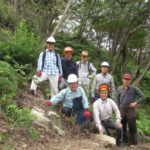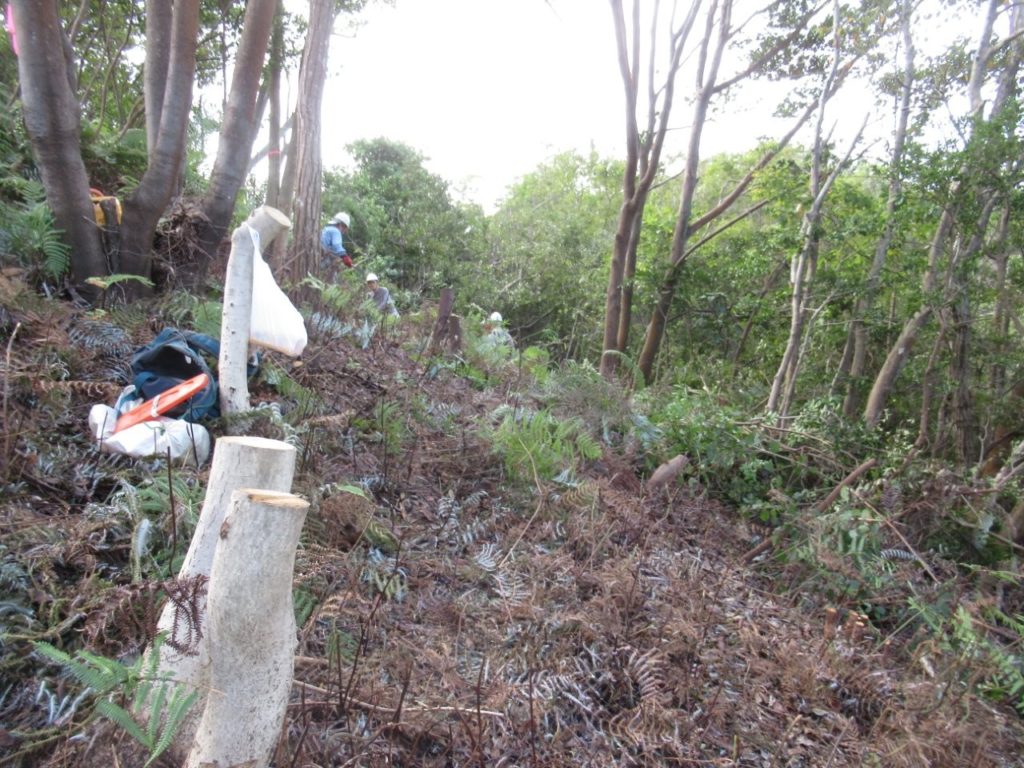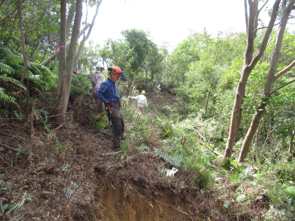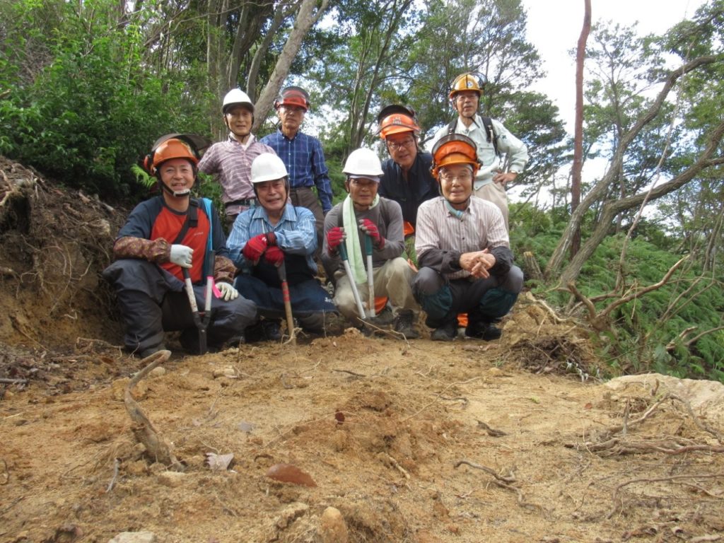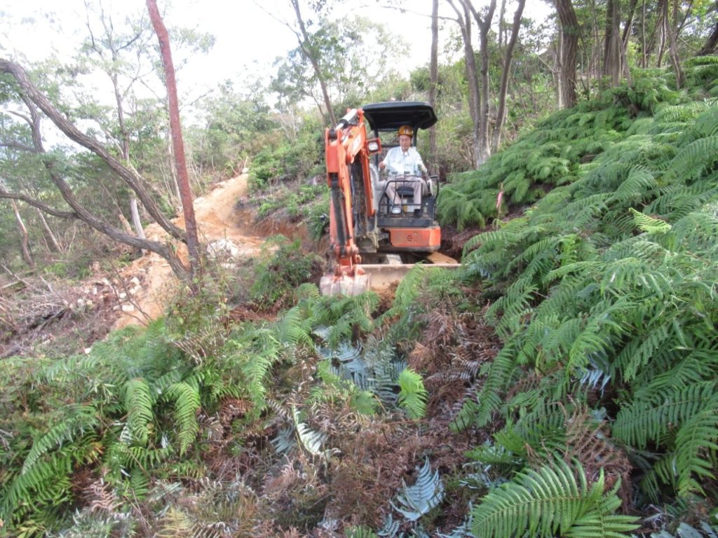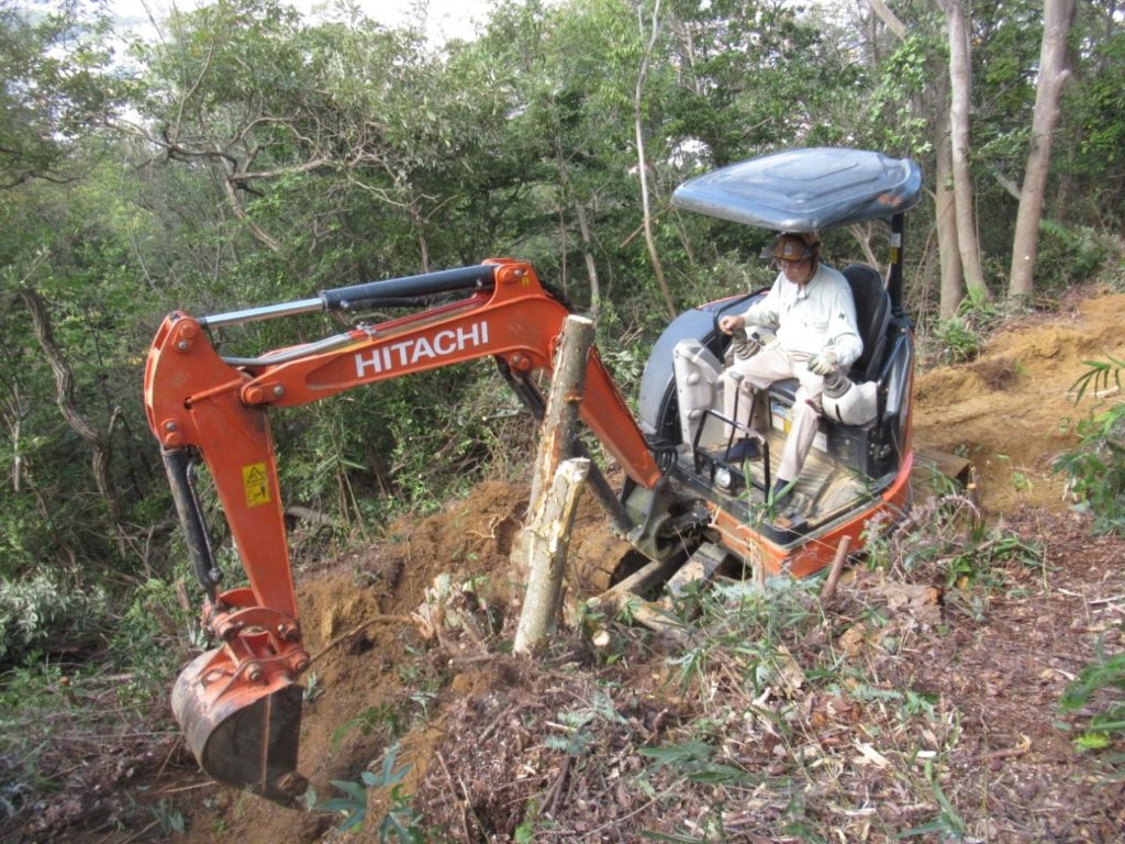 未分類2026.01.14鬼が城山北の道づくり ポスト シェア はてブ 送る Pocket 2025年(令和7年)10月9日(木) 参加者8名 本日は八畳岩と山頂間の登山道から7~8m北側の谷部の道づくりに取り掛かった。 ルートの中低木をチェーンソーで伐採し、道予定の下側に棚積みをした。 重機も本日は約30m進んだ。